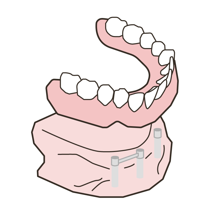 数本のインプラントを植立し、連結された維持装置に入れ歯を固定します。入れ歯が安定し、口の中で動いたり飛び出したりすることはありません。